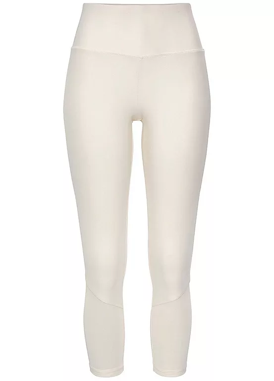 Cropped length athleisure leggings featuring contrasting coloured inserts and mesh inserts. A wide elasticated waistband adds comfort, and they are crafted from a breathable material with stretch content. Contrasting side stripes. Zipped pocket on the back.