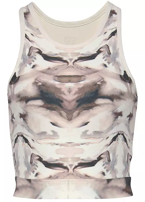 Breathable athleisure crop top with an abstract print on the front and on the wide cuffs. Straps and armholes with contrasting edging. Racer back with cut-out and small brand lettering. Great for workouts and other intense sports. Abstract print. With racer back and cut-out.