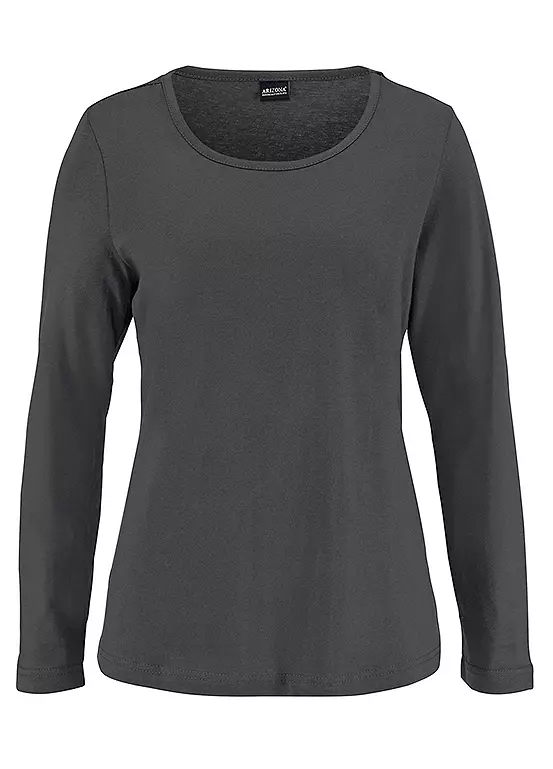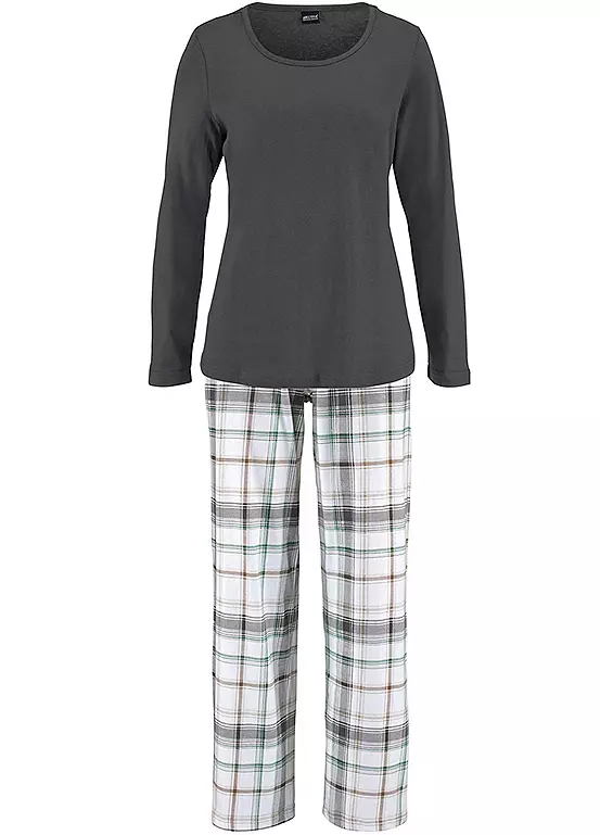 Arizona pyjamas featuring a grey top with long sleeves and a crew neck. The checked long pants are styled with straight legs and an elastic waistband.