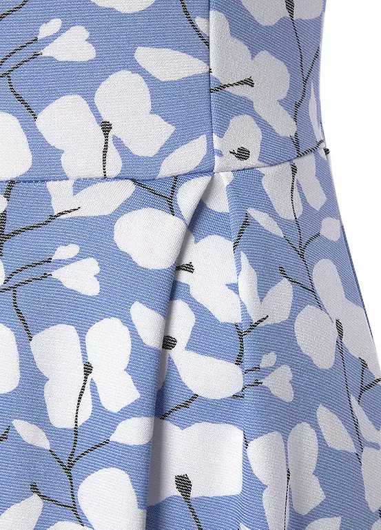 Charming midi dress with all-over print. Features crew neck, back with neck slit and button. With figure-flattering dividing seams and a wonderful summer look. Skirt section exhibited. Round neck. Sleeveless.