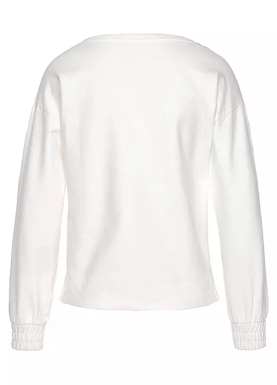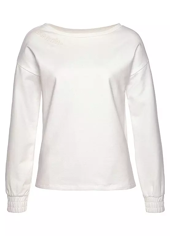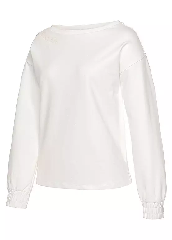 Check out the fashionable sweatshirt with a tone-on-tone logo print and comfortably wide round neckline with gathered cuffs. Very easy to combine a leisure look.
