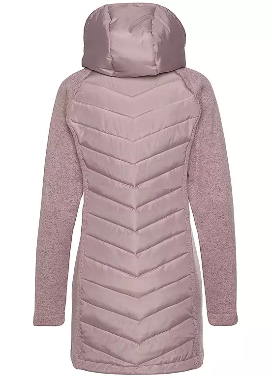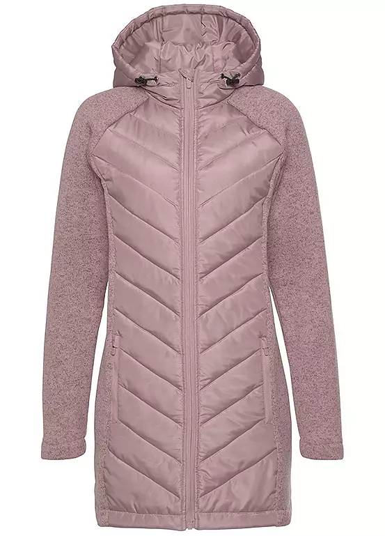 An outdoor quilted jacket with an adjustable hood, integrated drawstring and practical cord stoppers. Finished with side pockets with a zip, a full length zip and a narrow, straight cut. The warming quilted fabric and cosy knitted fleece ensure plenty of comfort. Quilted design with cosy knitted fleece on the sleeves. Adjustable hood.