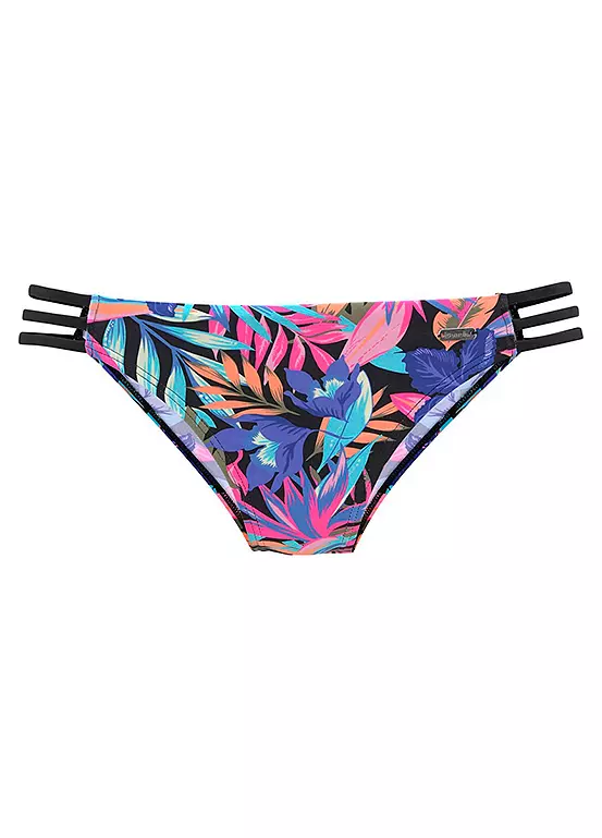 Stylish mix-and-match bikini briefs which have plain coloured side ribbons that extend the legs, and feature an all-over tropical print.