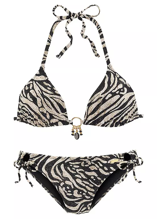 This triangle bikini is the ideal two-piece set in an elegant animal print with playful detail between the cups to create an extravagant look. The top gives you a well-formed décolleté with removable soft cups and it can be tied at the neck and back for optimal support. You will also find narrow straps on the bikini bottoms that you can adjust for a great fit. This trendy triangle bikini is a real must-have. Triangle design. Gold effect detail. Tie at the neck and back. Briefs tie at the side.