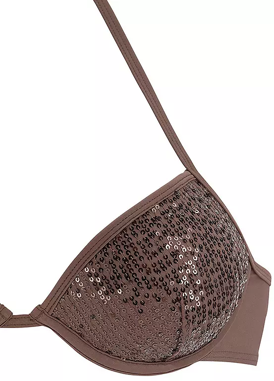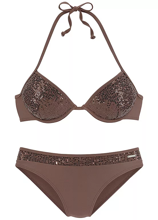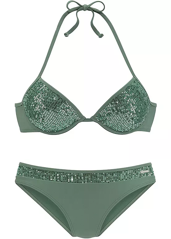 Sparkling push-up bikini decorated with shiny sequins. The bikini top is styled with padded cups and integrated reinforcement. The bikini pants are designed with a sequin insert at the waistband. Made from a highly elastic and comfortable material. Classic back closure. Halter necktie.
