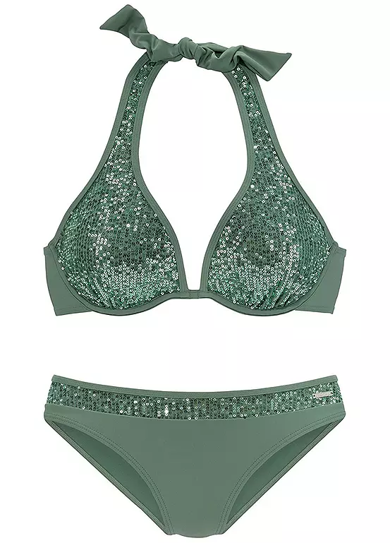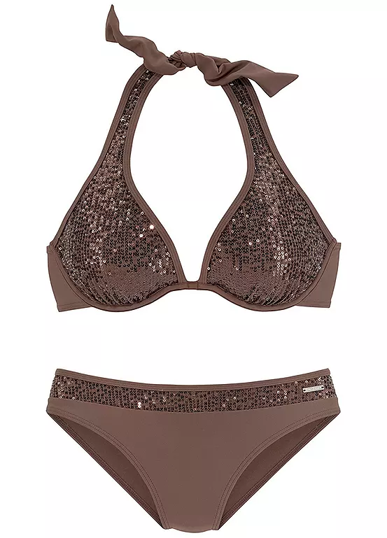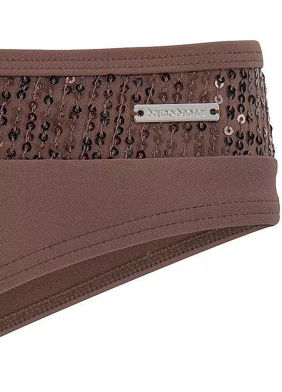 Elegant underwired bikini by Bruno Banani with sparkling sequins and removable soft cups. Great for the beach, it’s made from quick-drying stretch material. The top features a back fastening and ties at the neck, while the matching bottoms come in a classic cut. Shiny look with sequins. Removable soft cups. Hand wash. 80% Polyamide, 20% Elastane (Lycra® Xtra Life™). Lining: 100% Polyester.