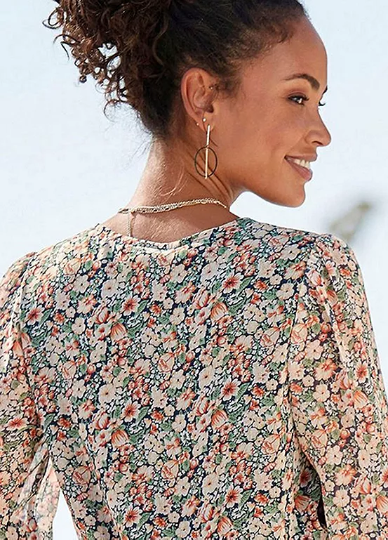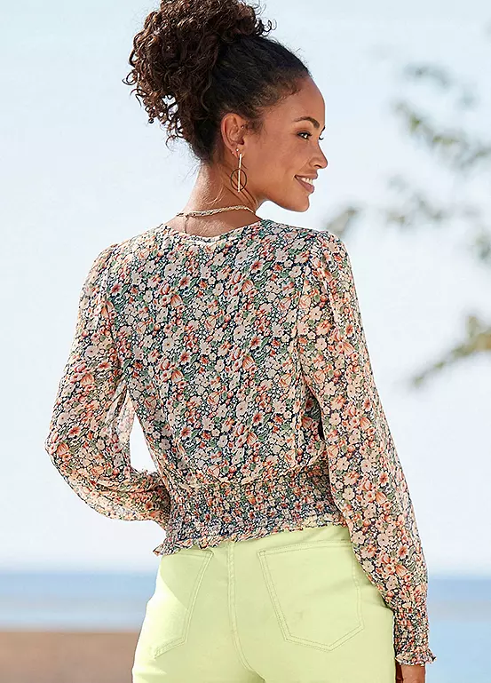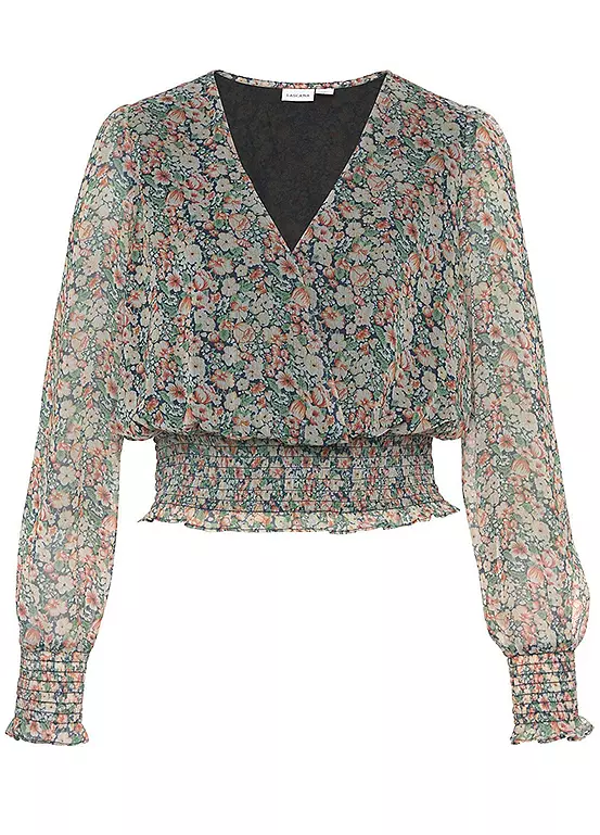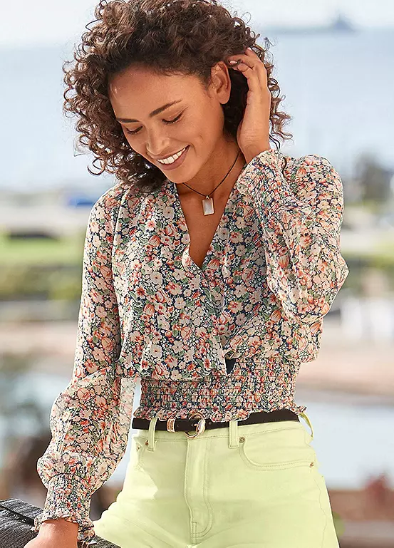 Romantic long-sleeved blouse with an all-over print and a smocked waistband. Finished with long sleeves with smocked cuffs and a partially lined fabric. Overlapping V-neckline. Long sleeve. Partially lined. Slightly transparent fabric.
