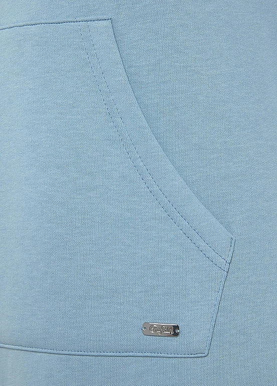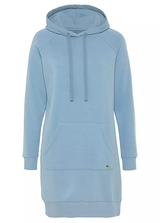 Fashionable hooded sweatshirt dress by Buffalo. Features a nice foil print along the hood and has long raglan sleeves, kangaroo pocket and ribbed cuffs on the hem. Made from a soft cotton material mix that feels great against the skin. Hooded sweat dress with foil print. Good Vibes slogan on the hood.