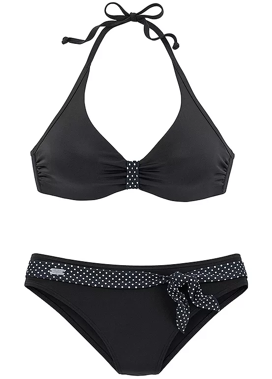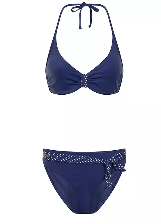 For a beautiful feminine look, this gorgeous underwired bikini features a cute polka dot design between the cups and on the decorative belt. Also featuring halterneck straps that tie around the neck and close at the rear, it is boned at the side for maximum support. A perfect elegant option for lazy days on the beach or by the pool.