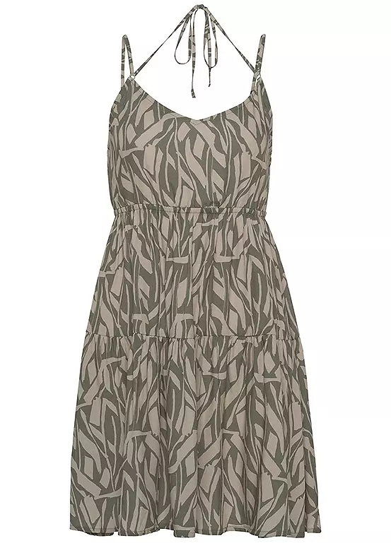 An airy jersey dress by Buffalo with a pretty all-over leaf print. With adjustable crossed spaghetti straps and a deep neckline. Made of light viscose, it features an elasticated underbust and a floaty skirt part with flounce. Deep v-neckline. Adjustable spaghetti straps. Machine washable. Outer: 80% Polyamide, 20% Elastane. Lining & Padding: 100% Polyester.