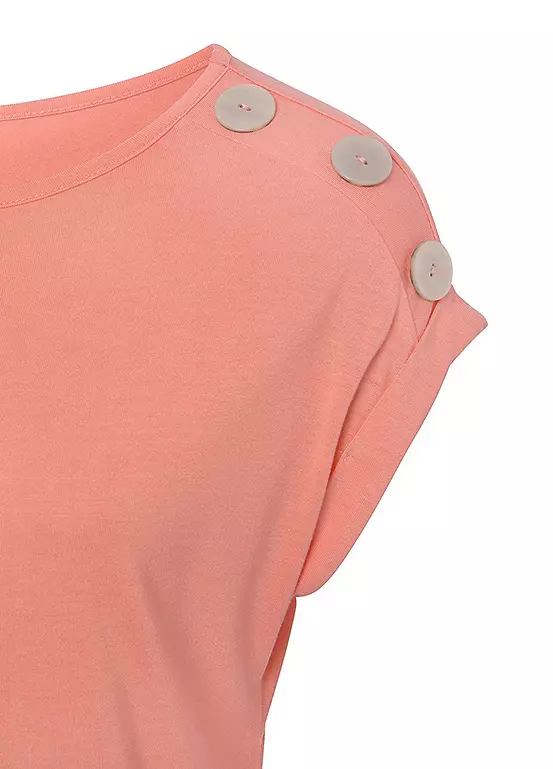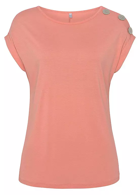 T-shirt with elegant mother-of-pearl buttons along the left shoulder seam and a round neckline and seamlessly attached short roll-up sleeves. Viscose jersey fabric with a soft feel.