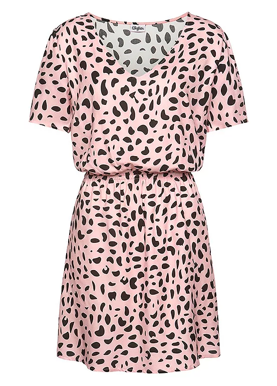 A chic summer dress with a stretch waist, a feminine v-neckline and short sleeves. This stylish all-over-print makes each item unique.