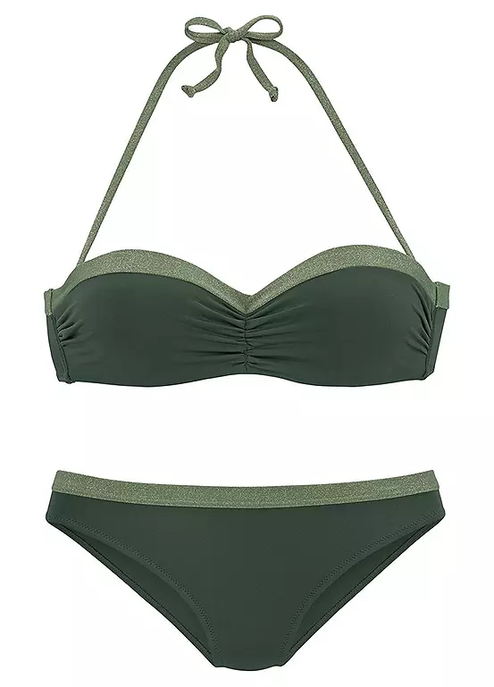 A two-piece, underwired bandeau bikini with a timeless design and a super comfortable fit. The bandeau top not only comes with the classic detachable straps, but also with removable padding in the cups. Finished with beautifully tailored briefs. Underwired. Sparkling inserts. Removable padding for cup A and B. Detachable straps.