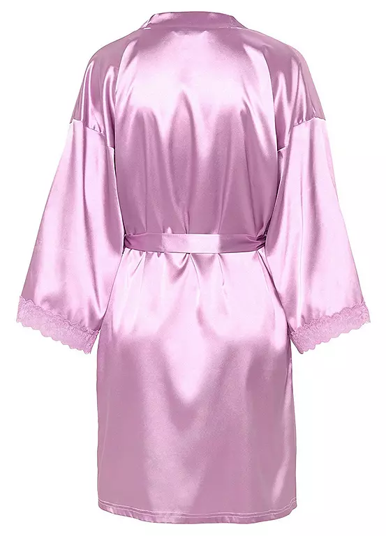 The fine lace inserts and the shiny satin quality make this kimono style dressing gown a must-have in terms of looks alone. It’s in a comfortable fit with wide three-quarter length sleeves, with lace trim and a loose belt at the waist. With wide 3/4 sleeves and a loose belt at the waist. Shiny satin quality.