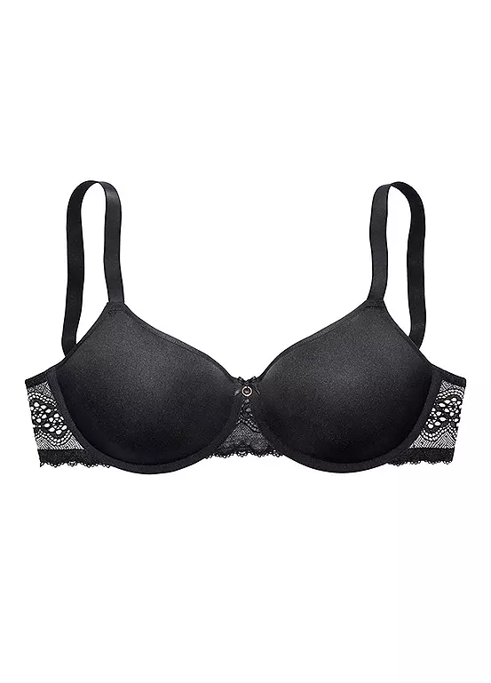 This fashionable bra combines maximum comfort with a perfect fit and beautiful lace. The seamlessly preformed soft cups are worked on underwire and model a beautiful breast shape to make it look a little smaller. Thanks to the flat and soft edges and the softly lined underwire, it guarantees maximum comfort without pinching. The smooth cups allow this bra to blend in under tight-fitting clothing while the back and the middle are made of delicate lace with a graphic look. A small decorative bow crowns the design in the middle of the front for a romantic touch. The straps and the back closure are individually adjustable. Optically reduces the bust by one size and gives it a nice shape. With integrated underwires for a secure hold. Individually adjustable straps and back closure.