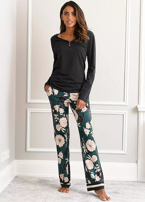 These pyjamas combine comfort with a great design. The unicoloured long-sleeved shirt has attached buttons in a mother-of-pearl look at the rounded V-neck for brilliant accents. But the eye-catcher of the two-piece set is the long, straight trousers with their all-over floral print, which ends in a contrasting pattern on the leg ends. The pyjama trousers are also equipped with a comfortable elasticated waistband and side pockets. The soft material makes these pyjamas pleasant on the skin.