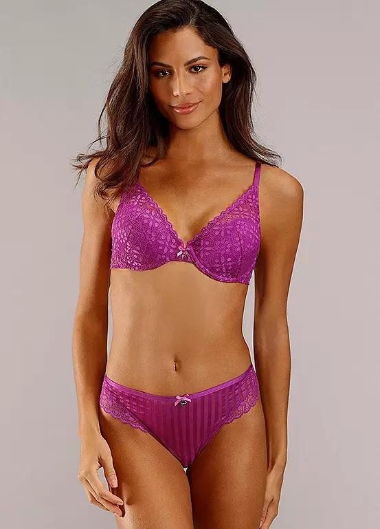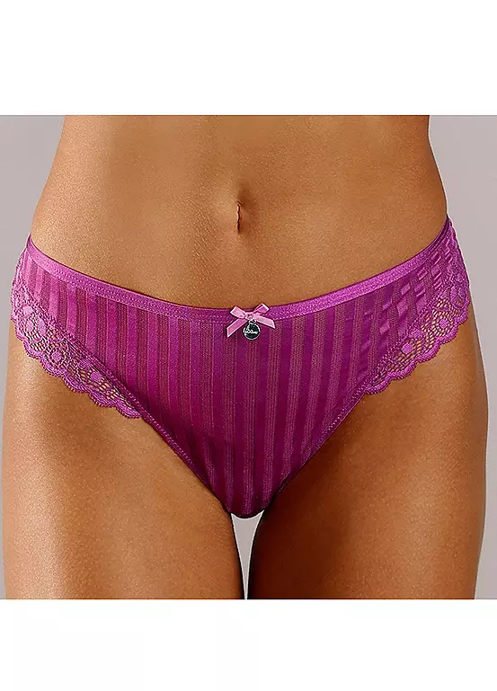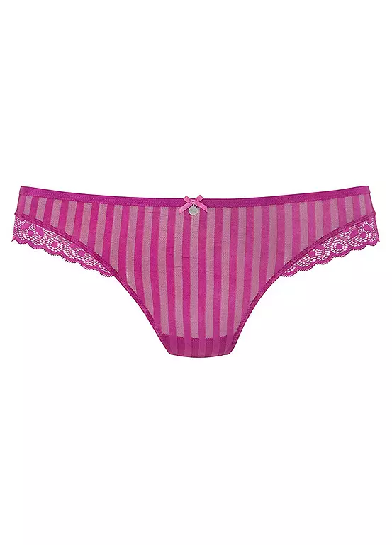 A pretty thong that combines soft, striped mesh fabric with feminine lace. Decorated with a small decorative bow and a metal label on the front and finished with a comfortable cotton gusset. Elastic mesh fabric with a striped look.