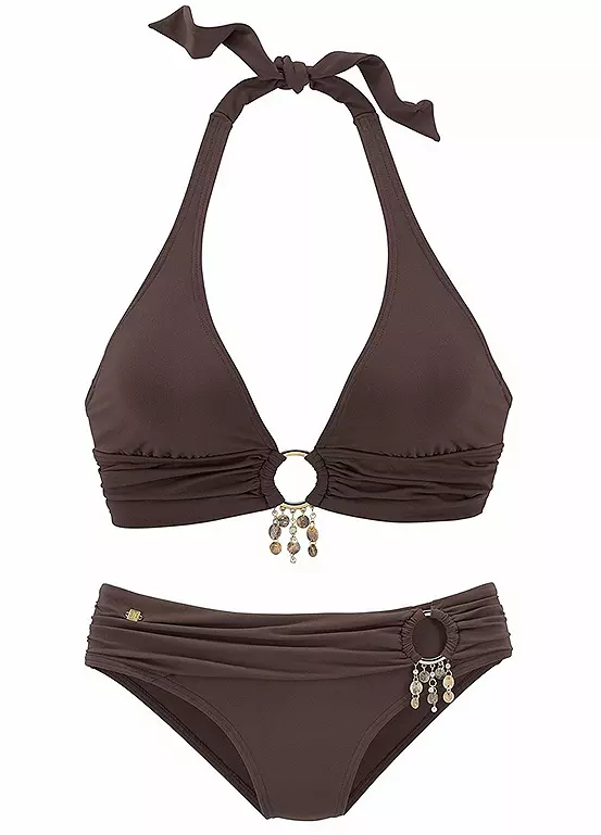 This stunning triangle bikini is a real eye catcher and comes with removable cups, halter neck and back fastening. The glittering silver rings and attached pendants between the cups, and to the left of the briefs make it a real must have for the beach or pool.