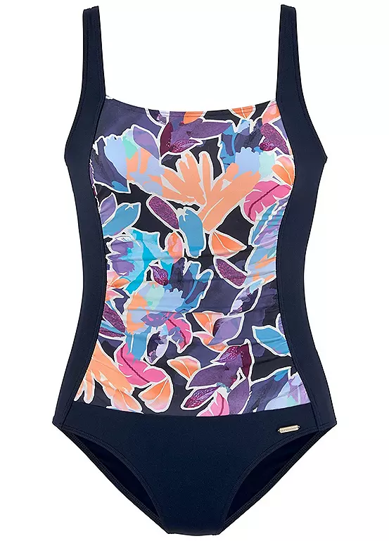 A soft microfibre swimsuit by Sunseeker with a modern pattern featuring a corset insert, integrated soft cups and an elasticated underbust for an optimal fit and good support. With a modern print. Adjustable straps. Machine washable. Outer: 84% Polyamide, 16% Elastane. Corset insert: 85% Polyamide, 15% Elastane. Lining: 100% Polyamide. Padding: 100% Polyester.