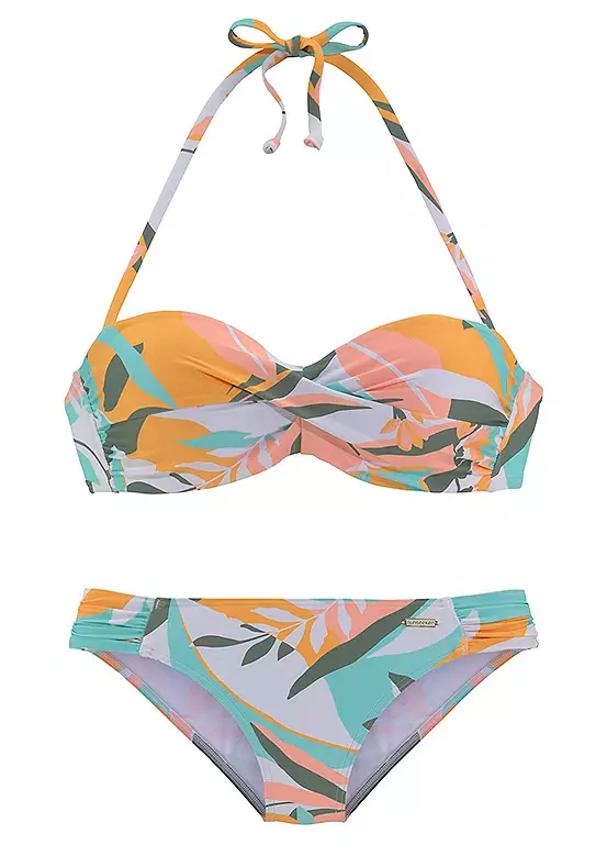 The underwired bandeau bikini offers perfect support thanks to the padded cups and the removable cushions for cups A to C. The top can be tied at the neck or worn without straps.