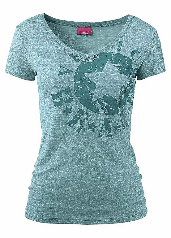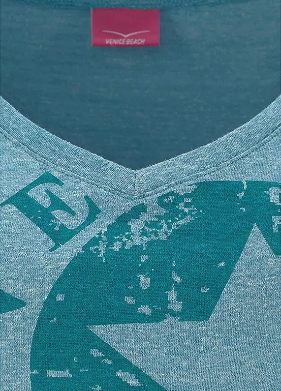 Cute and casual v-neck t-shirt in a worn marl look featuring a cool faded logo print on the front. Perfect for slipping on over your swimwear after a day on the beach.