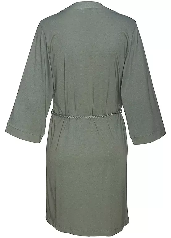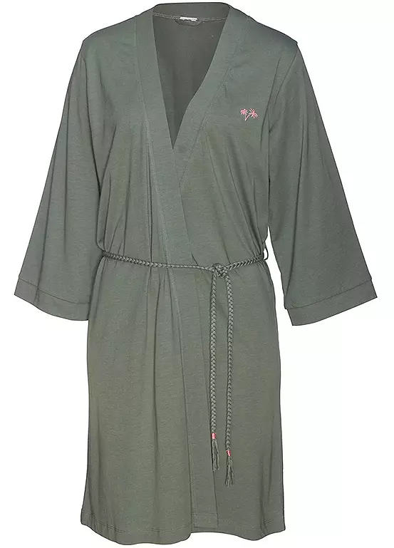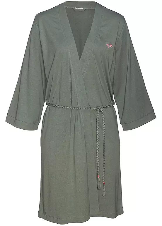 Exotic kimono designed with narrow sleeves and a panel at the front edge. Featuring a tie belt in the form of braids as a stylish detail.