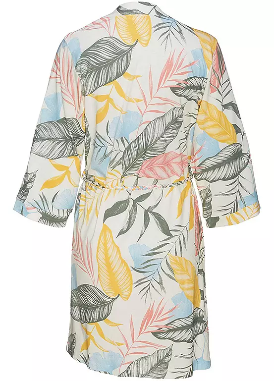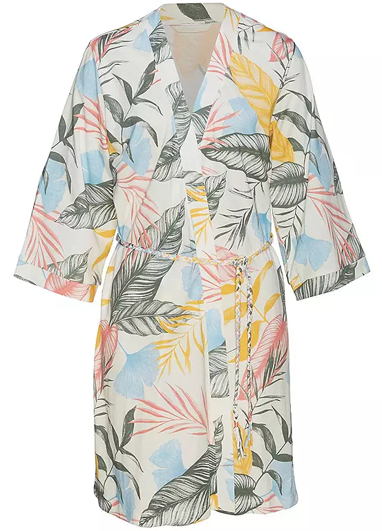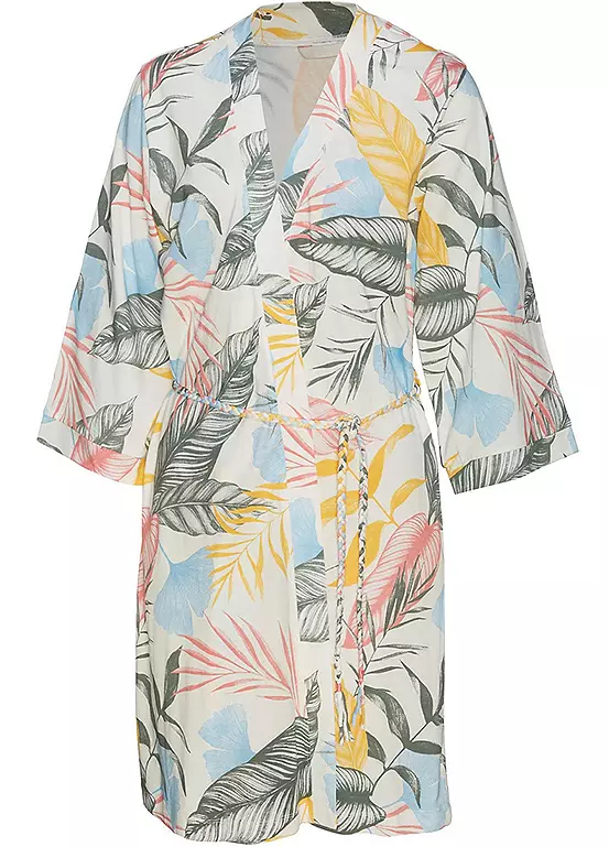 Exotic kimono designed with narrow sleeves and a panel at the front edge. Featuring a tie belt in the form of braids as a stylish detail.