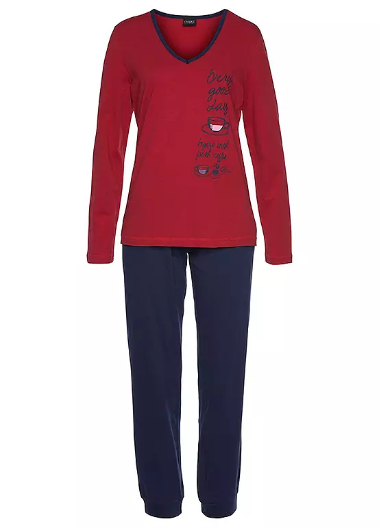 These pyjamas are designed with a v-neckline and a casual print on the front of the long-sleeved top. The pants in a contrasting colour come with ribbed, elastic cuffs and two side pockets.