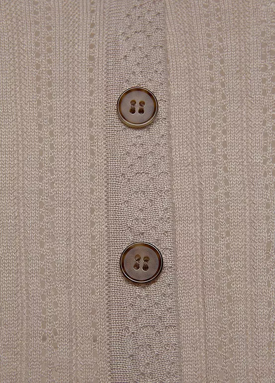 Romantic and casual top in a soft ajour knit. The ruffled ends on the sleeves and waistband give a cute and playful look while the horn-look buttons and knit pattern complete the look.