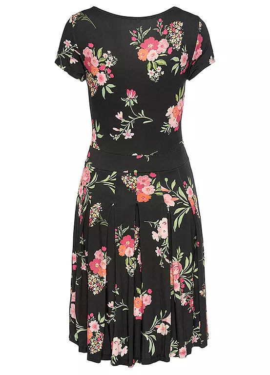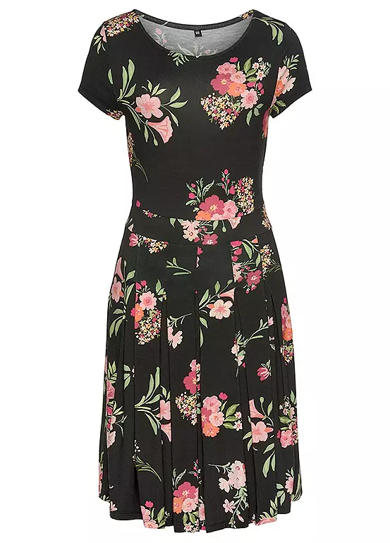 Stylish short sleeve dress with a gorgeous floral print featuring a round neck and a skirt with pleats. made from stretchy material that provides a great fit for all-day comfort. Perfect for the summer or trips abroad. Belt not included.
