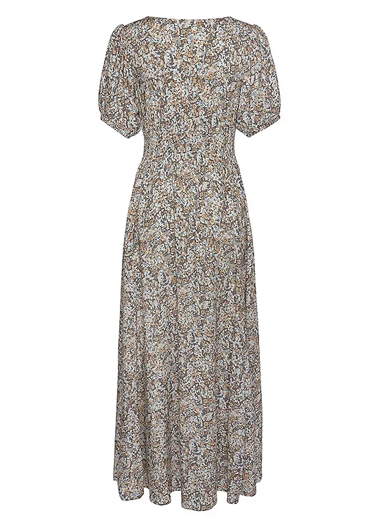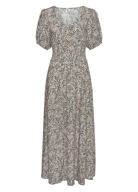 A lovely floral day dress, with a deep V-neckline and short puff sleeves. Wear with a sun hat and large sunglasses on your holibobs! Deep V-neckline . Short puff sleeves . Long skirt part . Made of woven viscose .