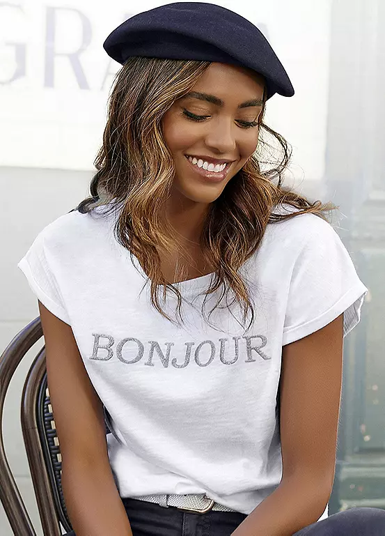 Casual t-shirts in a pack of 2. Styled with a fashionable front ’Bonjour’ print. Made from soft, textured cotton material. With turned sleeve hem.